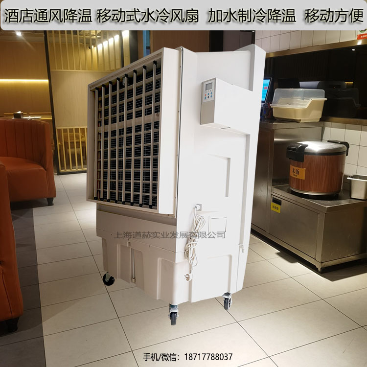 道赫移动式环保空调是一款可以放在地上移动推着走的环保空调,插上电,加上水就能用,人在哪里推到哪里,非常的方便。现在越来越多的客户选择使用移动式环保空调,比如网吧、户外餐厅、体育场馆等都在使用。